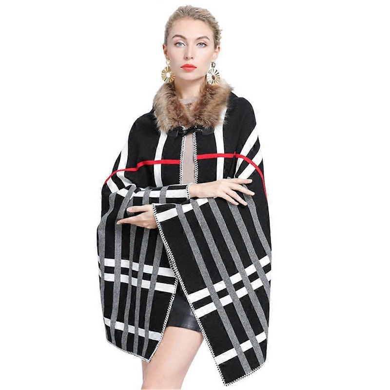 Name:Plaid Loose Pullover Shawls with Faux Fur Trimming Collar Knitting Cape for LadyMaterial: Acrylon,Polyester,ViscosePacking: 1 x Shawls Features:1.This shawls is super cozy,quite soft and comfortable to wear.Giving you easy going comfort in a stylish womens shawls you can feel confident in.2.Hand wash recommended for the first time.3.Great for indoor or outdoor sports events.as a wrap or cushion.it can become the first choice for daily matching.