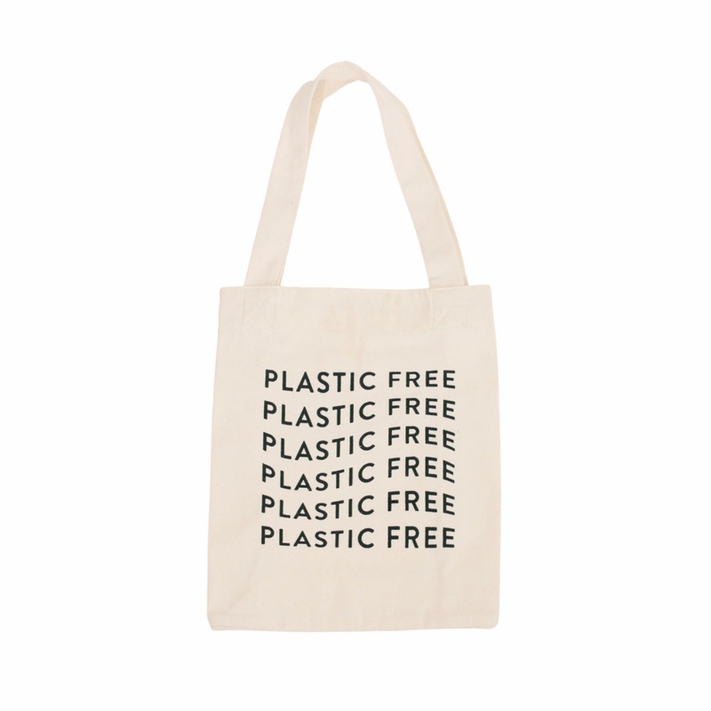 “Plastic Free” Canvas Tote – Our Plastic Free tote has an inside pocket and says “Shop Sustainably” on the back.