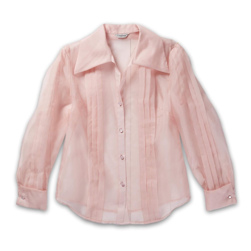J. Peterman Women's Sheer Silk Oversized Collar Blouse in Pink100% silk organza. Pearlized flat shank buttons down center front and on french cuffs. Pleats down front and on sleeves. Large collar. Sheer material (pairs best with J. Peterman Women's Silk V-