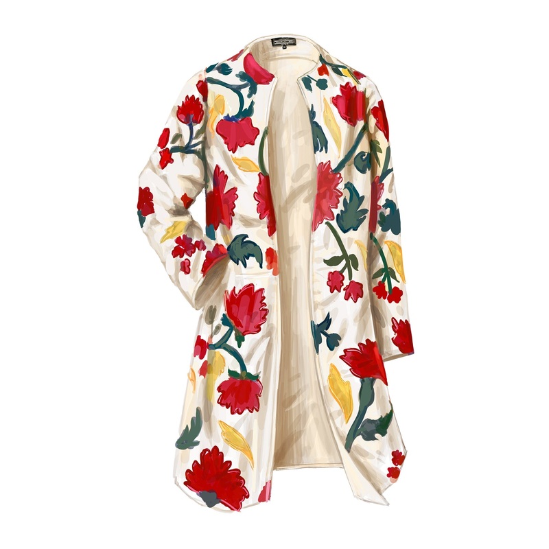 Quilted Applique Coat (No. J7940). Dramatic, collarless, quilted pure cotton embellished gorgeously with colorful allover floral appliques. Simple crew neckline. Light fill, perfect for spring days. Hook and eye closure at center front. Cotton lining. Mid-thigh length. Imported.