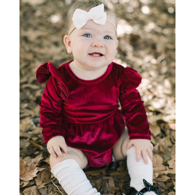 The Rhodes, now in velour! Complete with everything we love: ruffles, bubbles, muted colors & more, she stands out and holds up to any trendy piece for your infants & toddlers! The lightweight fabric dresses up the onesie style and when paired with a fring