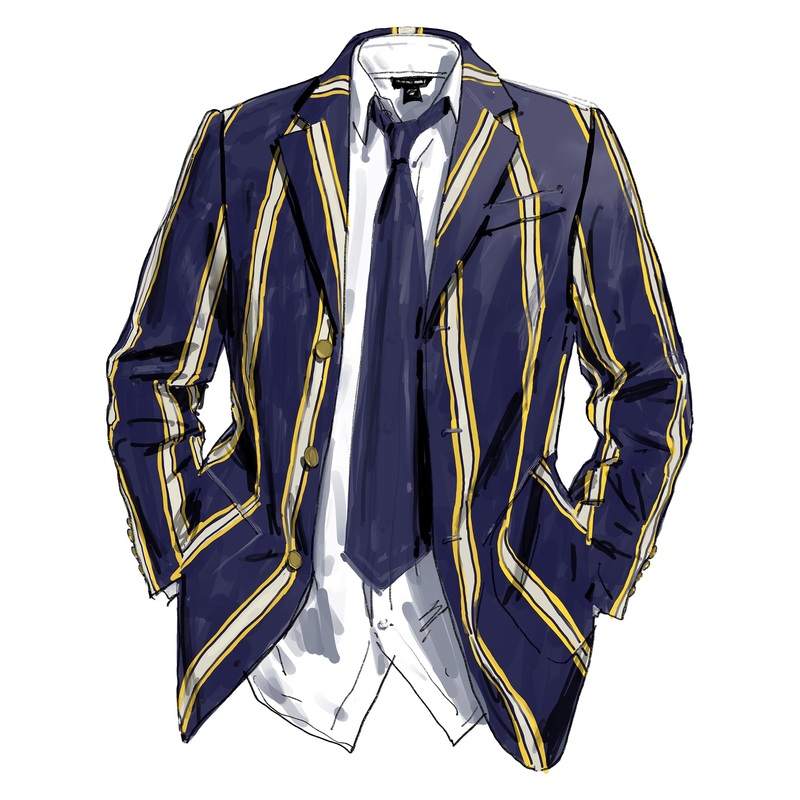The Rogues Boating Blazer (No. J5357). 100% cotton sateen. Notchedcollar felt undercollar, three antique brass buttons. Single-welt front pocket, patch pockets, two interior pockets. Standard shoulder pads, waist and back shaping darts. Single back vent. Half-lined. Dirty martini and shenanigans not included. Imported.