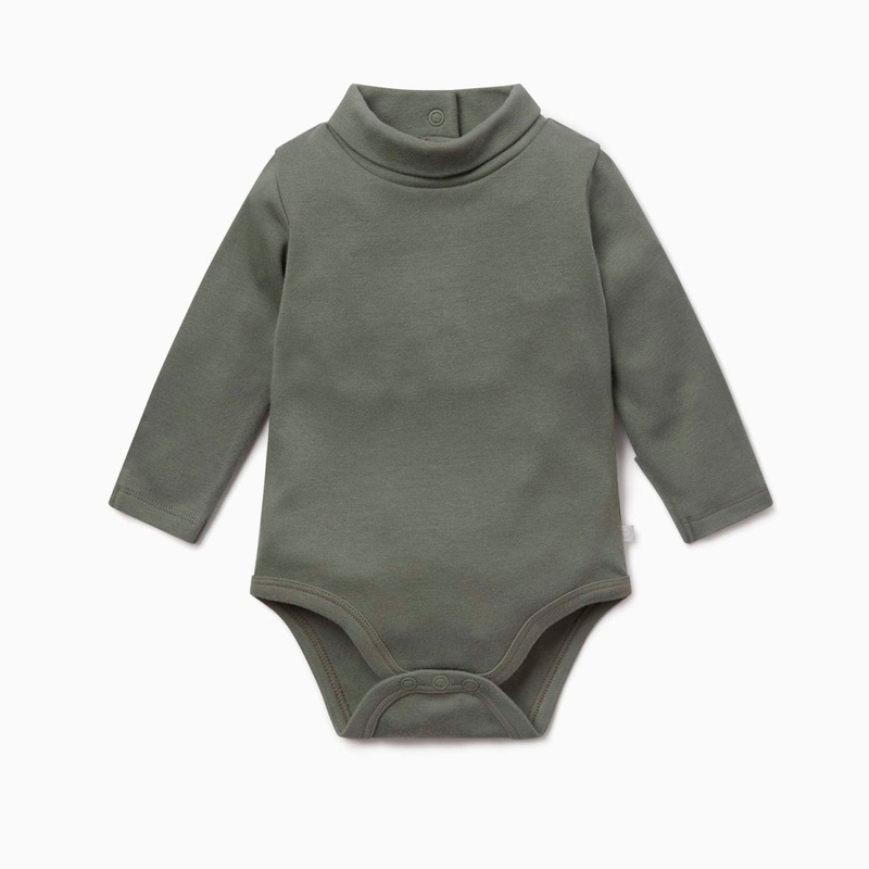 Crafted in sustainable organic cotton & bamboo, the super soft Khaki Roll Neck Bodysuit will keep your little one comfortable all day. It has a high neckline with poppers on the back to make getting them dressed for the day easier. Made from our signature organic cotton 30% and 70% bamboo fabric Back opening with poppers Fold over scratch mitts up to 6m High neck Poppers on crotch Nickel-free poppers