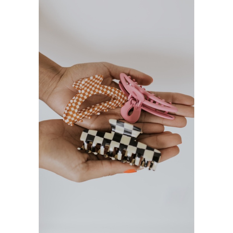 You have got to be kidding me with these. I think radical is the perfect word to use. Coming in a set of three: one black and white checkered, one orange checkered, and one pink – you can kiss boring hair goodbye! Throw your hair up in style this year with the Radical Claw Clip Set!