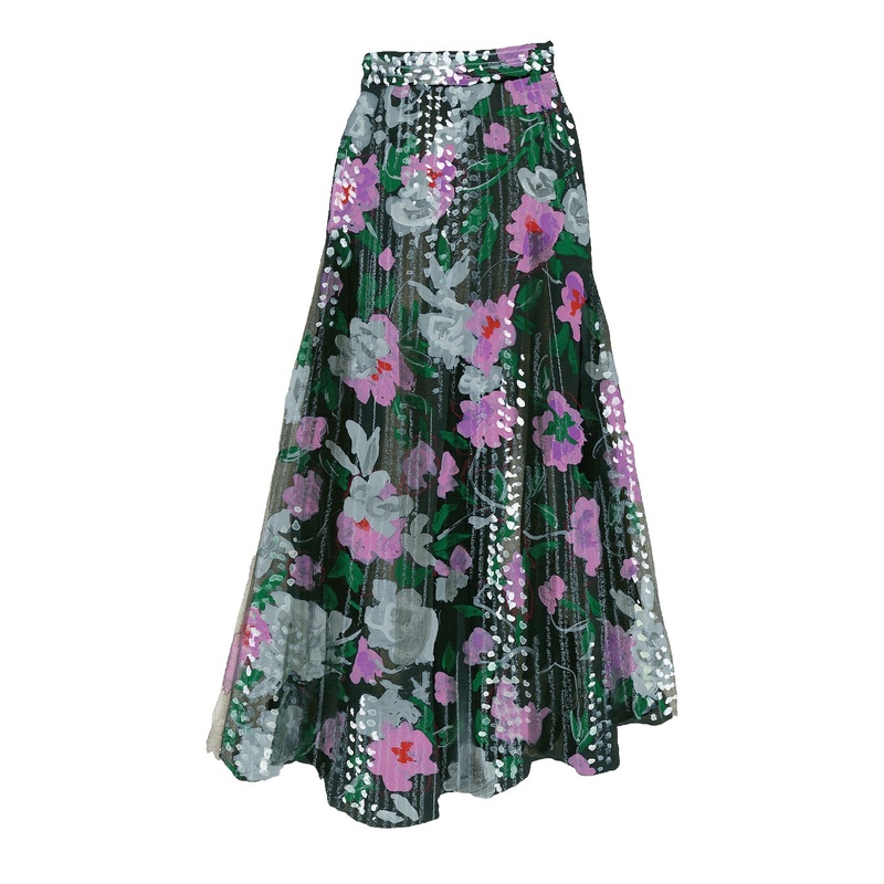 Roses and Sequins Maxi Skirt (No. J7908). The skirt of the season. Long, drapey, with a glittering sequin overlay printed richly with exuberant roses from waist to hem. Poly crepe de chine lining. Invisible zipper and hook-and-eye closure at wearers left s
