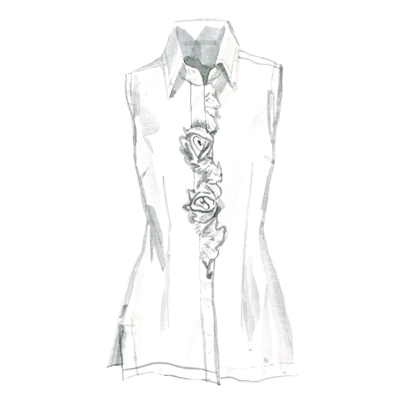 The Rosette Button Blouse (No. J3249), inspired by a time of enthusiasm. Stretchy cotton blend and side slits for self expression. Vibrant colors, a staple of the era. Shaping darts for a slimming fit. Seven hidden buttons under the front placket.Muse on e