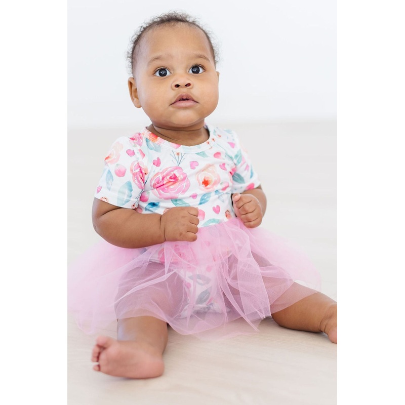Our Tutu Bodysuit is the perfect way to add a little bit of fancy, but still keep your baby comfortable. Tulle skirt is super soft and won’t be scratchy on baby’s skin. Snap closure for diaper changes. Matching twirl dress is available for big sis, cousin, or BFF.