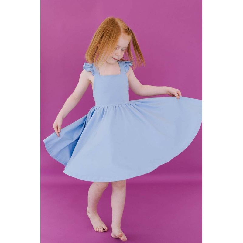 A ruffled pinafore is a fun twist on our signature ballet inspired twirl dress featuring extra soft and stretchy fabric with side seam pockets, a double lined bodice, scoop back and a full circle skirt for the big twirls were known for!Featuring our Baby B