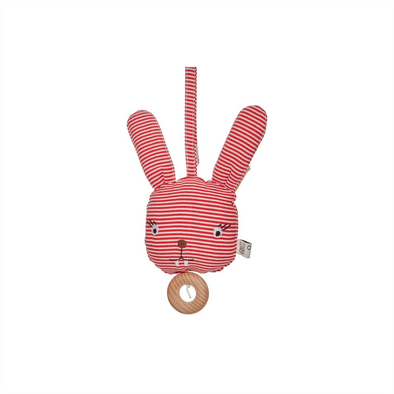 The music mobile with Rosy Rabbit creates a cozy atmosphere and will surely help your child fall asleep. The calm melody starts when the ring at the bottom is pulled down. The music mobile is made of denim and has a polyester filling.Melody: "Brahms' Lulla