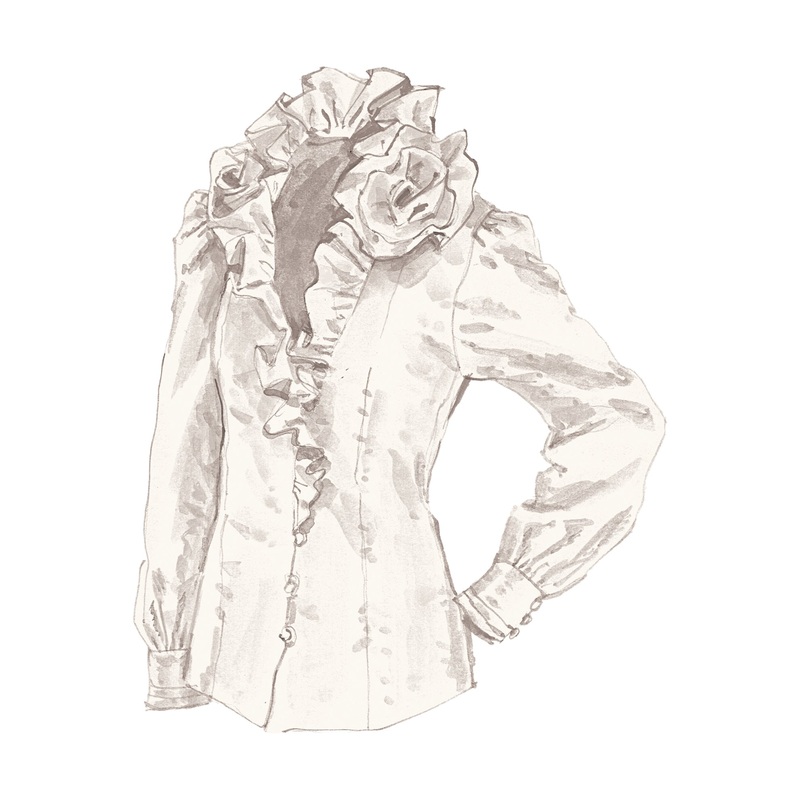Ruffle Neck Blouse (No. J5519). For the whirl of the season, which you might create all by yourself. Taffeta construction. Self-fabric rosettes flowing into ruffles. Six covered buttons down the front. Straight hem.Absolutely triumphant with a velvet skirt