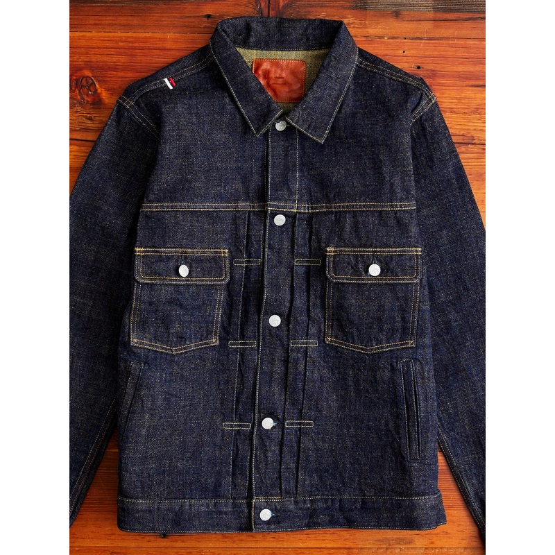 • This denim jacket from Tanuki is crafted from the brand’snew natural dyed low-tensionSoga fabric, rinsed to eliminate shrinkage. Tanuki’s Soga fabric features a 15oz denim woven using entirely short-staple Texas cotton with a natural saffron and turmeric dyed weft. Woven at a moderate 15oz weight, the fabric sports a low tension weave offering Tanuki’s signature slub and hairy nep. The jacket is cut in a modified Type-2 trucker jacket style, designed with added length in the body and hand pockets at the waist for a modernsilhouette and better utility.