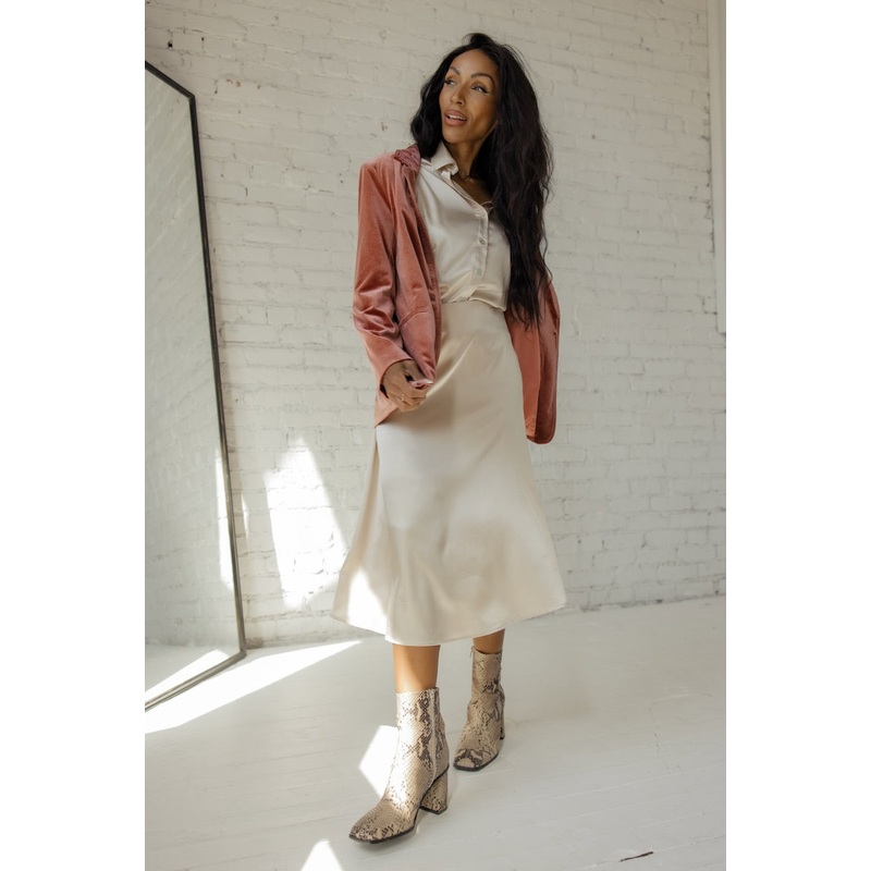 This skirt is made from strength and stardust. Drape this flattering and classic slip skirt on and you’ll be ready for anything. Featuring an elastic waist, side zipper, and silky material. Pair her with your sweaters or the matching top to complete your look.This skirt willshine so bright that you can give your crown the day off.