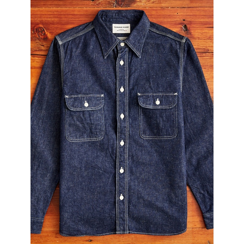 • Cherished for their beautiful fabrics and detail-oriented construction, Samurai’s shirtingis crafted with the same level of expertise as the brand’s denim. This shirt is sewn using amedium-weight denim with a classic indigo rope dye. The shirt incorporates Samurai’s own Japan-grown organic cotton, which gives a slightly neppy surface to the fabric. The shirtfeatures chain-stitched side seams, gusseted side vents, and custom detailing accentuating the brands uniquely Japanese ethos.