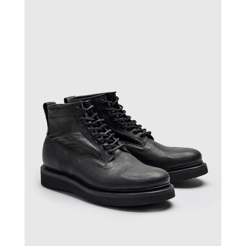 This iteration features Maryam Tannery’s vegetable tanned Washed Kangaroo leather, tanned in Santa Croce Sull’Arno Italy. The Washed Kangaroo leather is a lightweight full-grain leather with a supple buttery feel while still retaining a structured hand feel and durability. The leather’s waxy finish and high pull-up allow for a slow, rich development. Fitted with black Vibram 2021 black wedge outsoles for a comfortable cushioned step.