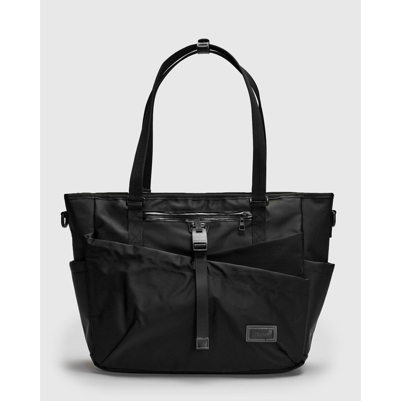 • The Scramble series from Master-Piece is crafted from a 1680 denier high density nylon fabric specially woven using twisted yarn for high durability. The tote sports a layered 2way design that can be worn over the shoulder or used with carry handle straps. Detailed with a layered front pocket design, the bag features an array of storage compartments complete with tonal stitching and cow leather trim.