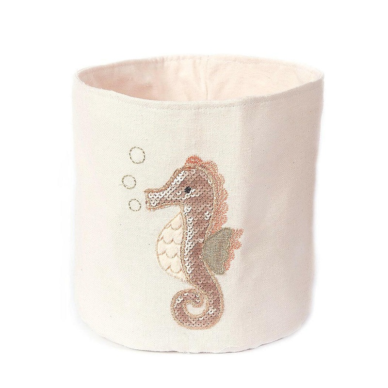 A beautiful addition to any room! With sequin appliques and stackable sizes, storage can be beautiful AND functional. Part of our Sequin Sensation storage collection, thislargesize bin in natural canvas andseahorse applique.