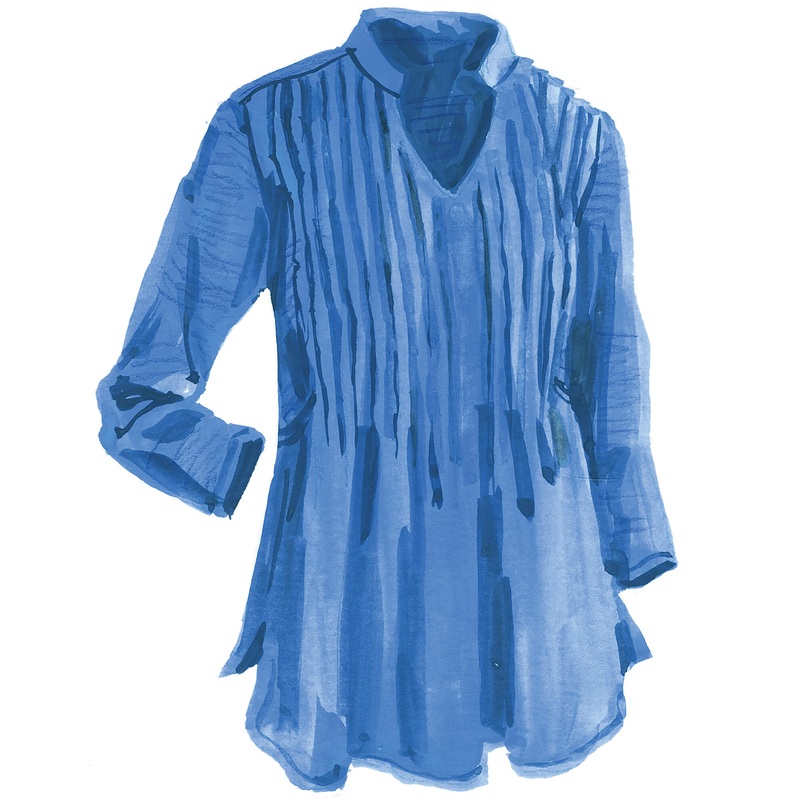 Sensible Jersey Knit Blouse (No. 5973). 100% linen blouse in soft and stretchy slub jersey knit. The band collar and front panel are woven linen. Easy pullover style. What makes this better than a plain old t-shirt is the V-neckline and the pintucks down the front. 3/4-length sleeves, side slits. Made in India.