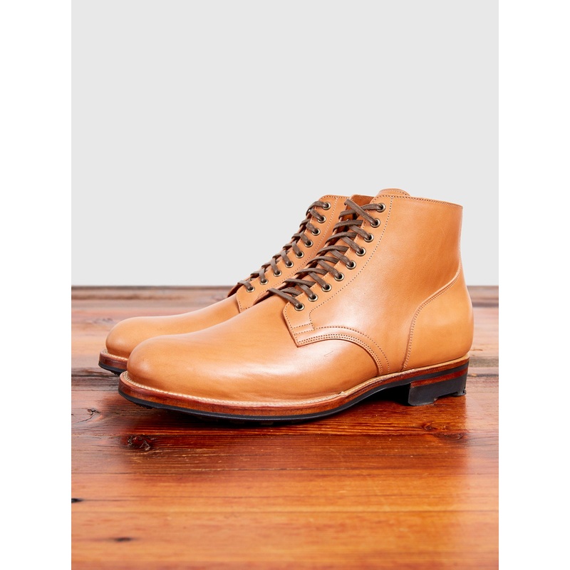This iteration features Color 1060 Bruciato TPR Horsebutt from the Italian Maryam Tannery. This innovative tannage utilizes extra thick skins onto which a special resin is laminated to the surface of the hides, resulting in an all-conditions leather with an elegant shine, similar to Shell Cordovan. The boots are anchored byblack Dainite soles and fused together using stitch down construction. Finished with tonal stitching, branded leather insole, and brogue toe caps.