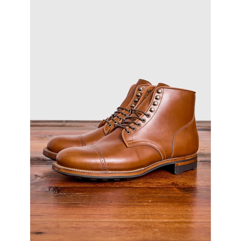 This iteration features a semi-aniline Vocalou French Calf tannage courtesy of Tannerie d’Annonay of Annonay, France. This tannage features a very high shine, similar to Shell Cordovan with a degree of natural grain transparency giving the leather it’s signature skin color depth. The boots are anchored by Brown Ridgeway soles and fused together using stitch down construction. Finished with tonal stitching, branded leather insole, and brogue toe caps.