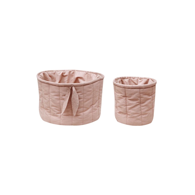 Crafted from organic cotton poplin, this set of two soft baskets is ideal for storing your baby essentials within easy reach. Choose from three color options to match your nursery decor. The baskets are expertly quilted with GRS certified recycled polyester fill, ensuring both comfort and sustainability. The larger basket features a charming bamboo leaf decoration that adds a touch of natural beauty. Keep your baby products organized and stylish with these practical and eco-friendly baskets.