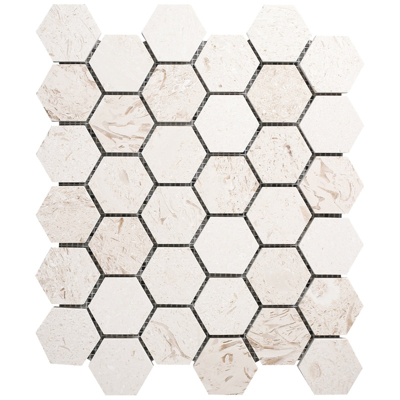 Shell Stone Limestone 2″ Hexagon Honed on 12″ x 12″ Mesh Mosaic Tile has small depressions and crevices within each stone to project a modern and natural look.