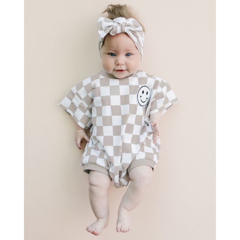 Add some checkered style to your little one’s wardrobe with this bubbly romper featuring a popular smiley design. And the best part? It’s gender neutral!
