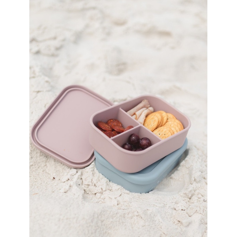 DescriptionSilicone bento box lunchbox. Three compartments- Approx 7.3" long x 5.4" wide x 2.6" tall- Dishwasher safe, easy to clean- Microwave safe- Made of BPA-free, FDA-approved food-grade silicone.