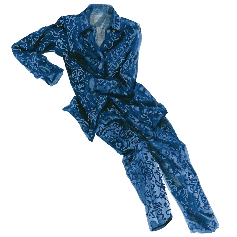 Silk PJ Top (No. 6831) in lavish 100% silk jacquard with monochrome Far East print. Button-down style, sleeve shirt with pointed collar and loose boxy fit. Fabric-matched buttons. Imported.