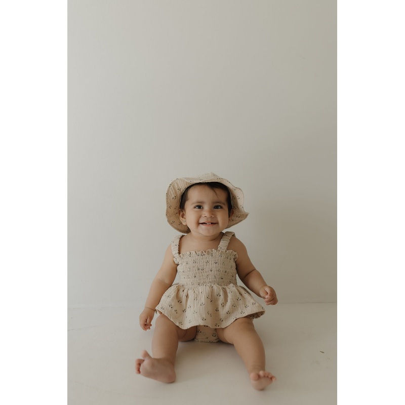 A lightweight muslin tank romper with ruffle details and a matching hat. Snap closure makes diaper changes easy.Complete the look with our other muslin styles in this print for a sweet matching moment.Sizes Available : Newborn - 24 MonthsMaterial : 100% Co