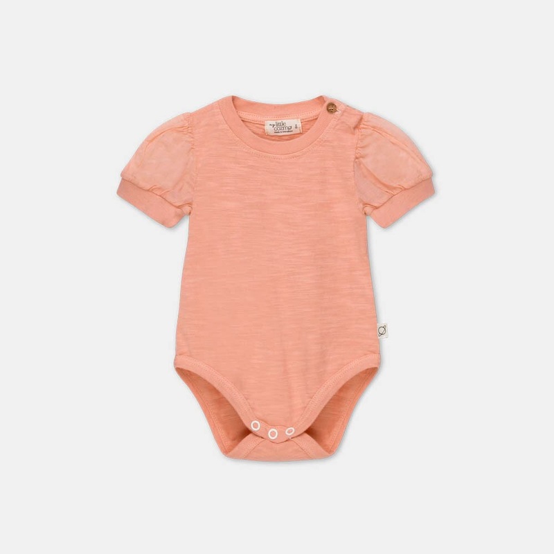 Rescues are brand new items with tags, sourced from aging collections and offered to you at a discount. Most overstock & retail returns in America are thrown away or kept in storage – by rerouting this inventory to Manymoons, with your help we are able to keep these products utilized and out of landfills. This organic slub bodysuit has a crew neck, a button closure at the shoulder, short puffed sleeves, and snap fasteners at the gusset.