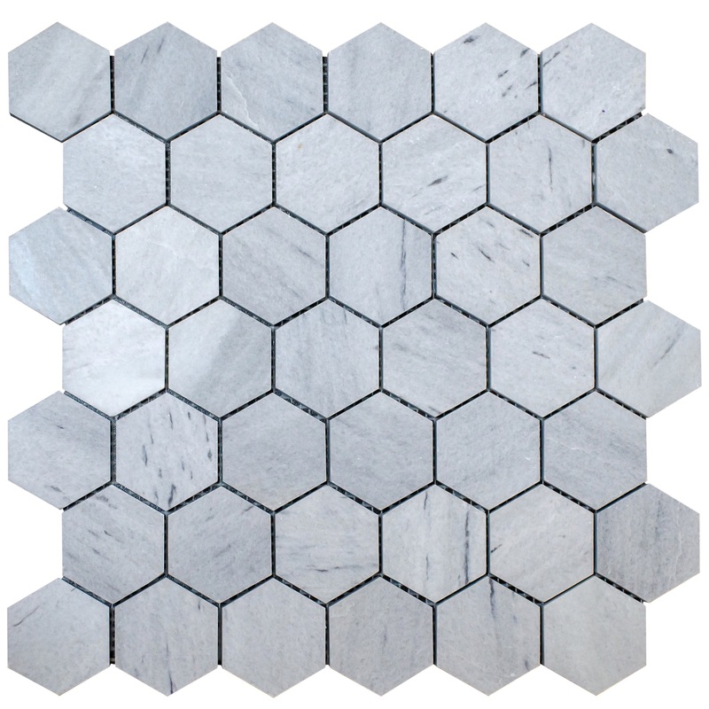 Solto White Marble 2" Hexagon on 12" x 12" Mesh Mosaic Tile has small depressions and crevices within each stone to project a modern and natural look.Great product for your kitchens and bathrooms. Predominantly whiteand gray, these 12 in. x 12 in. mesh-mou