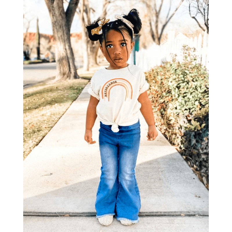 Retro, BB! THE classic bell bottoms are here and they are your new favorite staple! Pairwith a Maggie Cap Leo, graphic tee, or cute BB top to bring your mini’s style to the next level. This dark wash denim style has an elastic band to make it an easy and comfortable must-have!