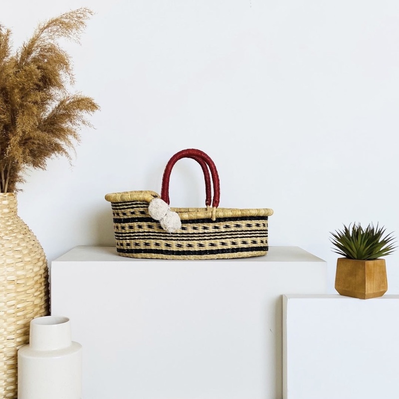 Perfect gift for the little mini in your life- Due to the handmade + hand dyed nature of this basket, color (navy/blue), pattern + leathermay slightly vary- Made in Ghana from elephant grass, chemical and fire retardant free. Dye from native plants.- This