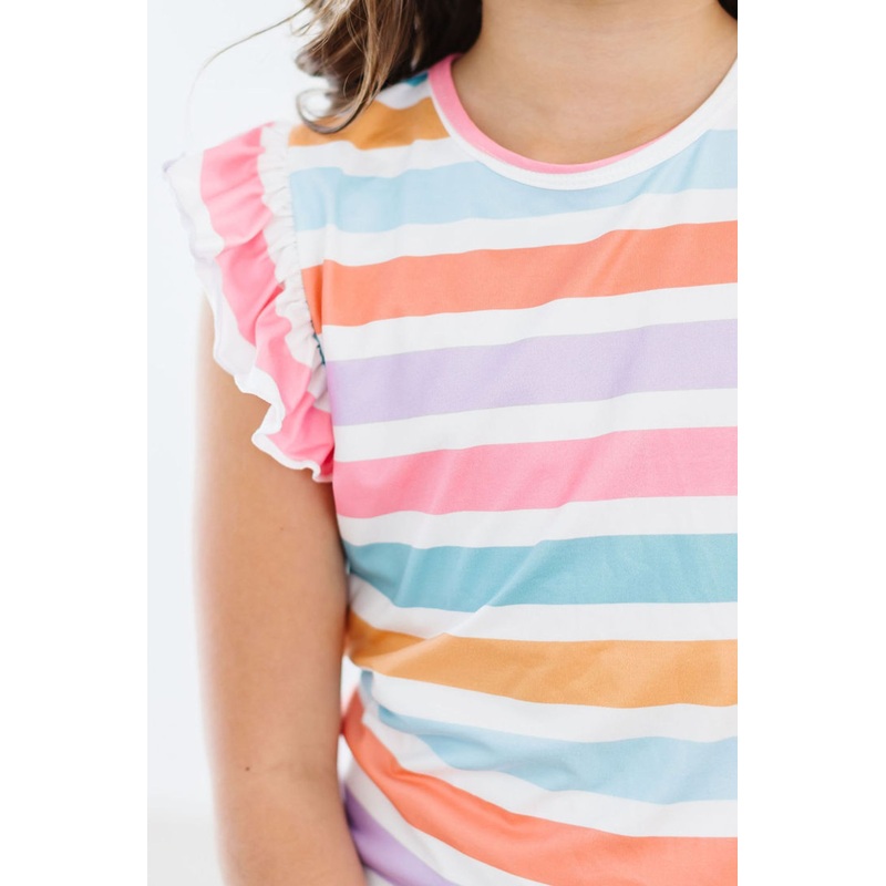 Our founders created the ruffle tee when they could not find the perfect basic tee for Mila. They wanted something simple but still girly. Our ruffle tee is perfect with skirts, shorts, leggings, or layering under jackets.Mix and Match our Spring Stripes p