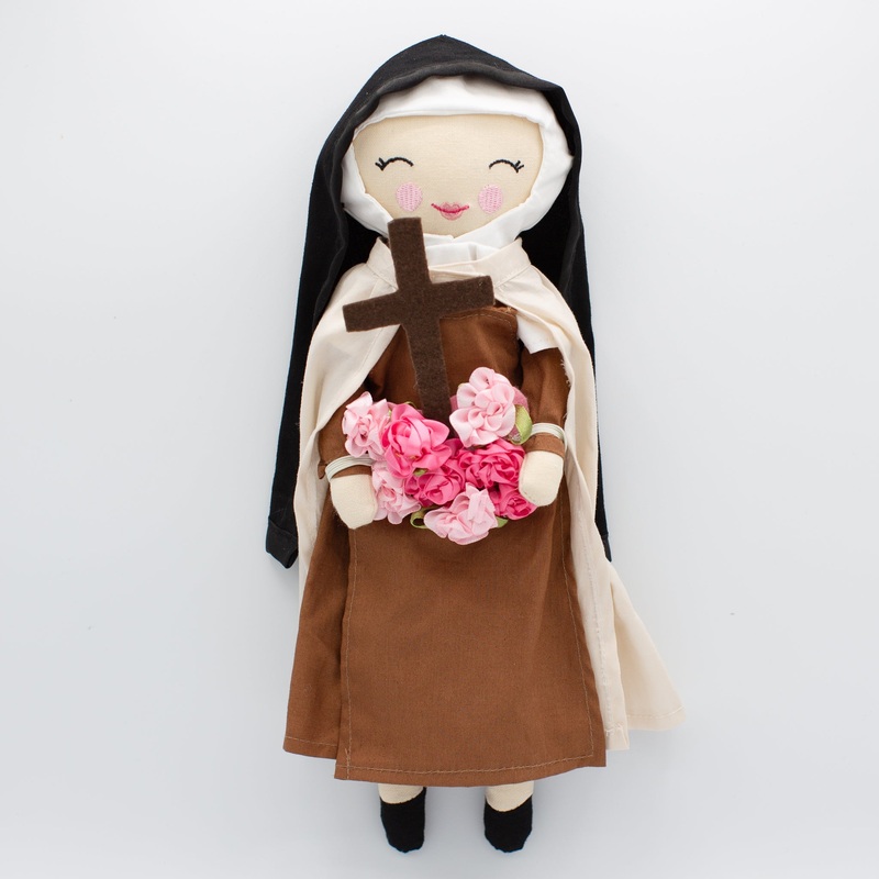 She is clothed in the traditional Carmelite habit worn during her day. The outer cloak is removable (with velcro attachment). The bouquet of roses with cross (which are traditional symbols of St. Therese) has two elastic straps that can be slipped over the dolls wrists so that she can hold the bouquet. Each doll is hand-sewn and finished with lovely embroidery.