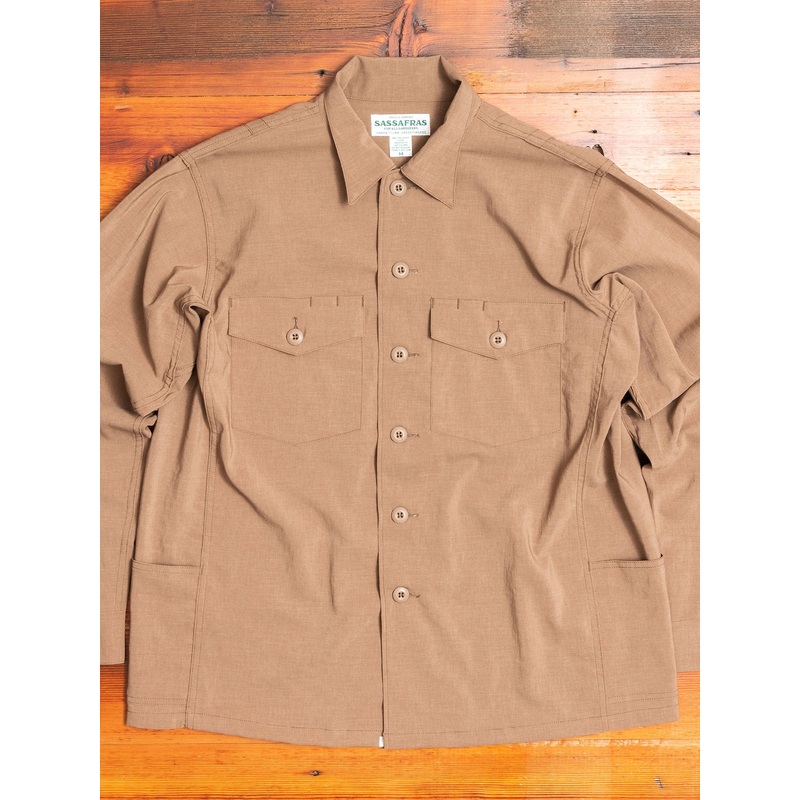 • Crafted from alightweight poly stretchfabric, the Half Gardener shirt from Sassafras is a relaxed fit button-down built with utility in mind. Receiving cues from carpenter pants, the shirt features tool pockets at the side and dual utility pockets at the chest. Woven with asleek and smooth texture, theshirt is lightweight yet durable and sports a leisurelyloose-fittingsilhouette that is easy to wear.Made and designed in Japan, the shirt comes fittedwithcats-eye buttons, a pointed collar, and tool straps.