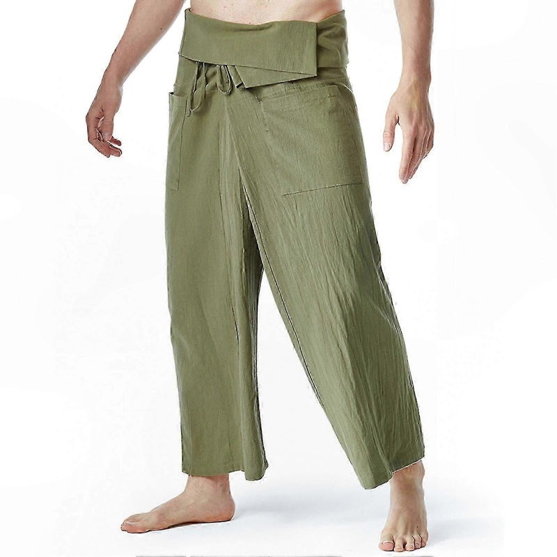 Featuring a loose style and drawstring waist, these pants accommodate various body types and provide comfortable wear without feeling restricted. Designed with large pockets, they offer ample space to store a mobile phone, keys, coins, and other small items. These pants are a wardrobe essential thanks to their simple solid color design. The breathable fabric helps keep you cool and dry during hot weather, making them ideal for activities such as sauna, spa, meditation, martial arts, yoga, and more. Made from high-quality flax material, the pants are soft, breathable, and comfortable to wear. This product comes in one size only. Suitable for everyday wear, office settings, beaches, shopping, and other casual occasions. Item Name: Thai Fisherman Pants Material: Flax Gender: Men Style: Casual Season: Summer Size Type: Regular Fit: Loose Length: Ankle Length Features: Comfortable, Solid Color, Soft Size Details: One Size: Waist: 142cm/55.91″, Hip: 132cm/51.97″, Length: 85cm/33.46″ (Approx.) Notes: Please refer to the size chart to select the appropriate size. Due to differences in lighting and screen settings, the item’s color may vary slightly from the images. Package Includes: 1 x Thai Fisherman Pants