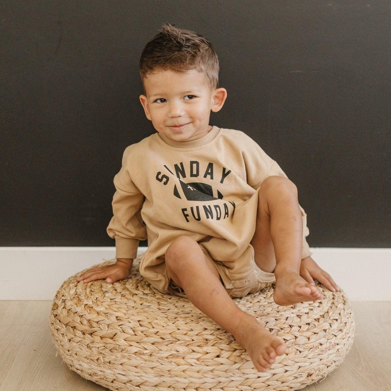 Elevate your Sundays with our “Sunday Funday” Graphic Oversized Sweatshirt Romper. This romper features convenient snaps at the crotch for easy dressing and diaper changes.
