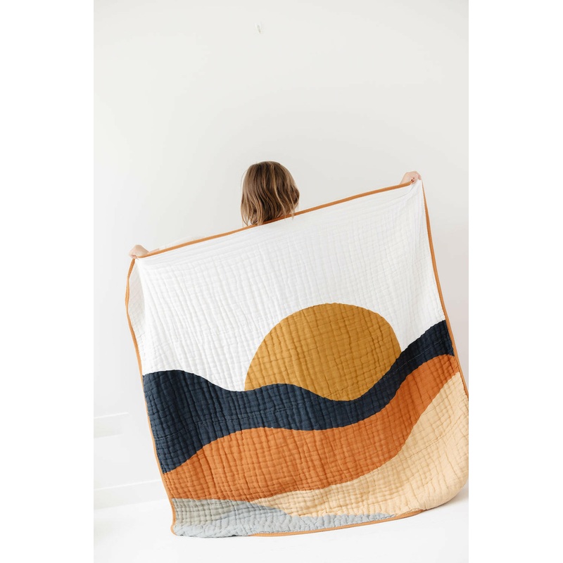 A golden sunsetting over the mountains. Four layers of muslin come together in a breathable but warm quilt perfect for babies, toddlers, cribs, play time, picnics, and pictures.