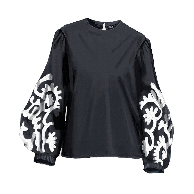 Suzani Embroidered Top (No. J7913). 100% cotton poplin with bold white embroidery on the dramatic puff sleeves. Elasticized cuffs. Keyhold closure with one shell button at back neck. Imported.