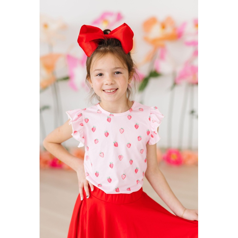 Our founders created the ruffle tee when they could not find the perfect basic tee for Mila. They wanted something simple but still girly. Our ruffle tee is perfect with skirts, shorts, leggings, or layering.Mix and Match our Sweet Strawberries print colle