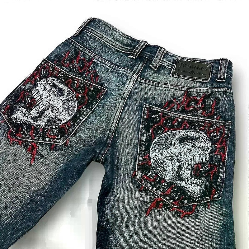 Description Y2K Fashion New Hiphop Skull Graphic Embroidery Blue Retro Jeans Streetwear Men And Women Popular Harajuku Gothic Wide-leg Pants