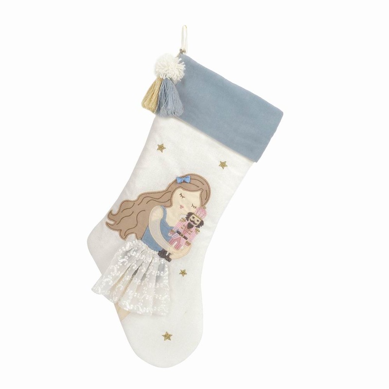 You??re never getting coal with a stocking this fa-la-la-la fabulous! Mon Ami pays homage to the heroine of The Nutcracker with this winter blue Clara stocking boasting a luxurious tri-colored tassel and plush velvet trim. Featuring an exquisitely detailed Clara embracing her beloved Nutcracker, our 21-inch Christmas stocking is ready to be packed with presents. A wide monogrammable hem lets you personalize this Nutcracker stocking while a durable loop makes it easy to hang anywhere in the living room. Gift our deluxe Christmas stocking to someone special in your life??or keep it for yourself.