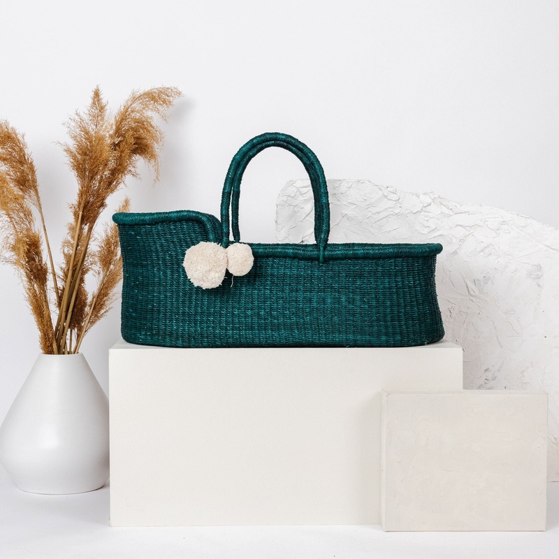 Perfect for newborns and infants who cannot sit up or roll over unaided.- Due to the handmade + hand-dyed technique color/shade WILL VARY- Handmade in Ghana- Made from elephant grass, chemical, and fire retardant-free. - Basket comes with a comfortable mat