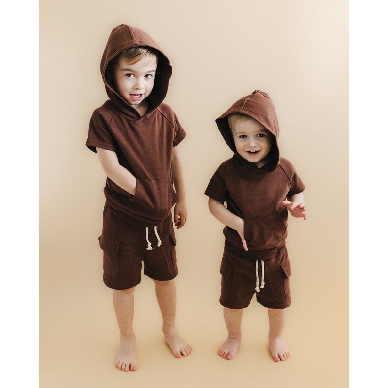 Embrace warmth and comfort with the Terry Cargo Shorts Set in Chocolate. Crafted from high-quality French terry fabric, this set is ideal for transitioning into both spring and summer. The breathable, soft fabric keeps your little one cool, while the cozy hooded top with a front pocket and the cargo-style shorts with multiple pockets combine style and practicality. Available in 5 colors, this set is perfect for sibling matching, so your kids can all enjoy matching outfits for every occasion!