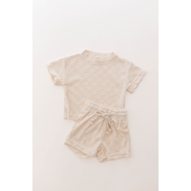 Treat your little one to our trendy terry cloth checkerboard short set! Made with soft and absorbent fabric, this cream-colored two piece set is perfect for ages 0-9 years. Stylish and comfortable, it's the perfect addition to their summer wardrobe. Order