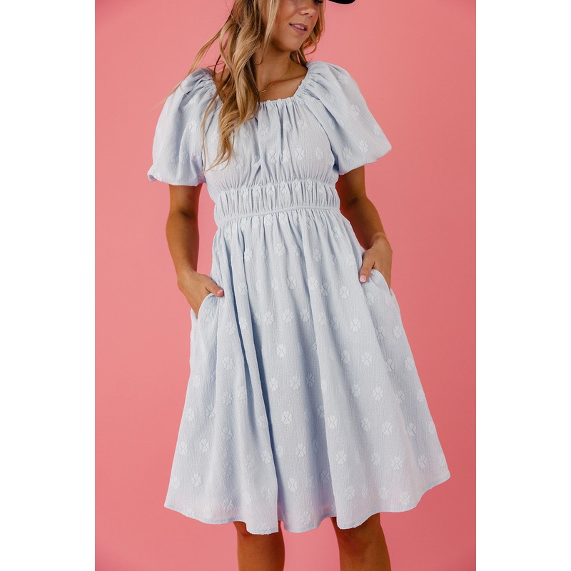 "Honestly, who are we to fight the alchemy?"Serious question. Slipping into this dress is like finding love all over again. It's got puff sleeves and a square neckline, with pretty flowers stitched on soft, textured baby-blue fabric. Complete with a double