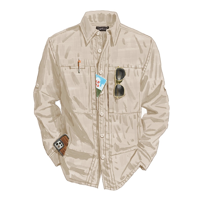 The Anglers Shirt (No. J8715). Made froma performance cotton nylon blend for unhindered movement. Four hidden, on-seam zipper pockets for protected
