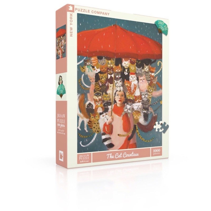 These cats won't let a few raindrops spoil their day as they take a trip outside with Miss Mink neatly under her umbrella.From Miss Mink: Lessons From A Cat Countess By Janet Hill.Whimsical Painting by Artist Janet Hill1000 Piece Jigsaw PuzzleFinished Puzz