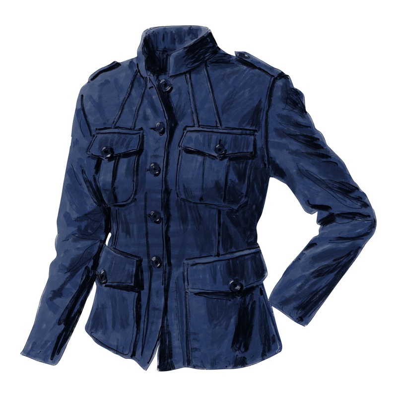 The Correspondents Jacket (No. 7267). Inspired by female reporters at the front lines in WWII. Garment dyed 100% cotton. Black faux shell buttons. Four box pleat pockets on front. Band collar. Back vent. Imported.